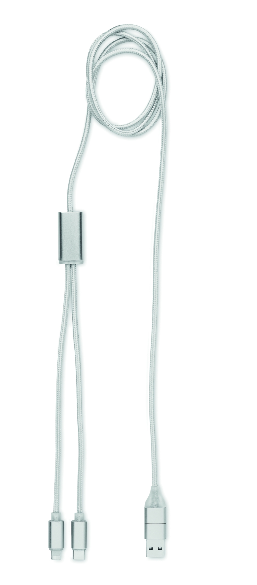 Cavo di ricarica in alluminio con ingresso: 2-in-1 tipo-c e tipo-a e micro-b (2 in 1 pin), uscita tipo c e micro b. lunghezza del cavo: 120 cm.