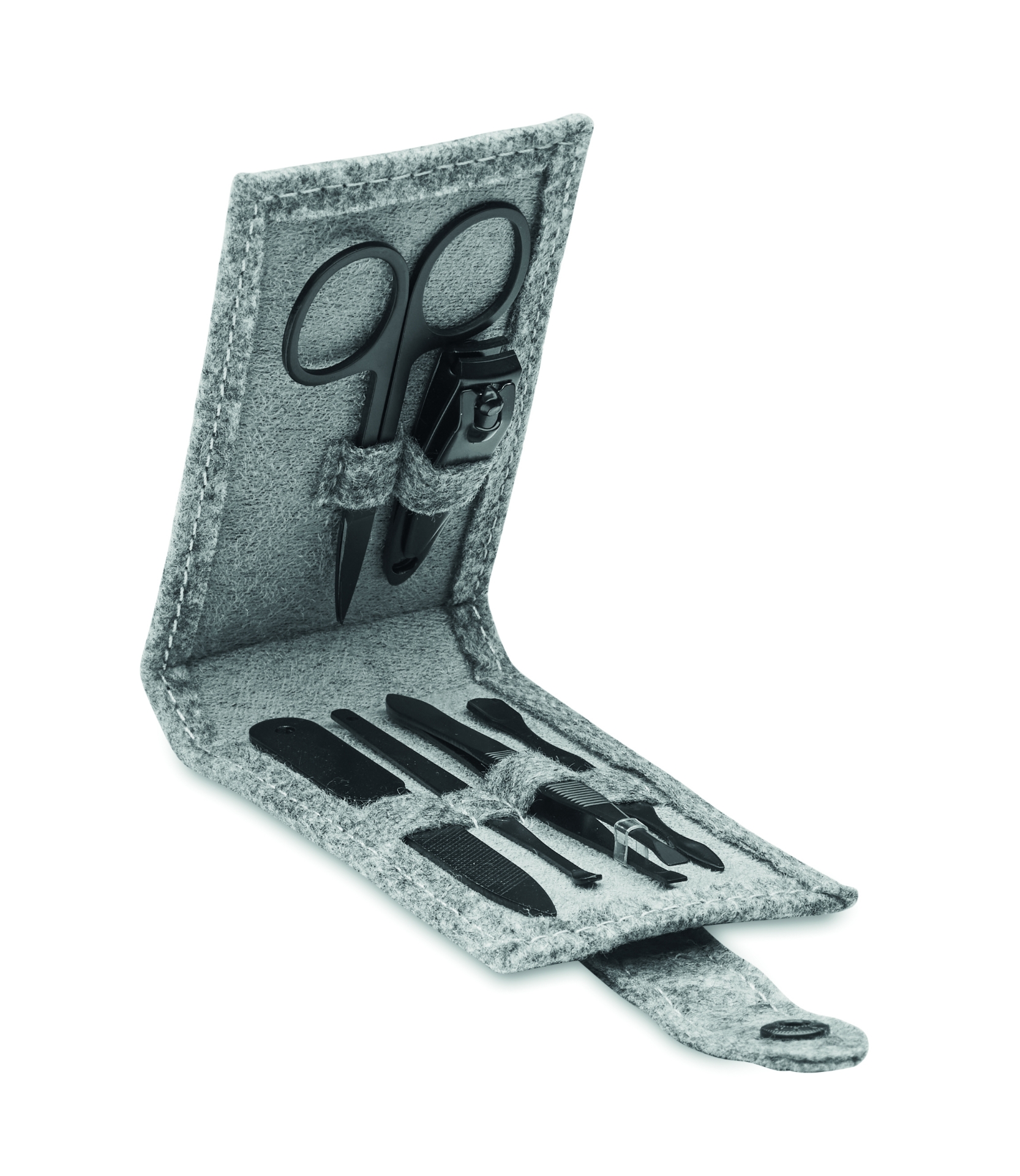 Set per manicure da 6 pezzi in acciaio inox in astuccio rettangolare in feltro rpet.