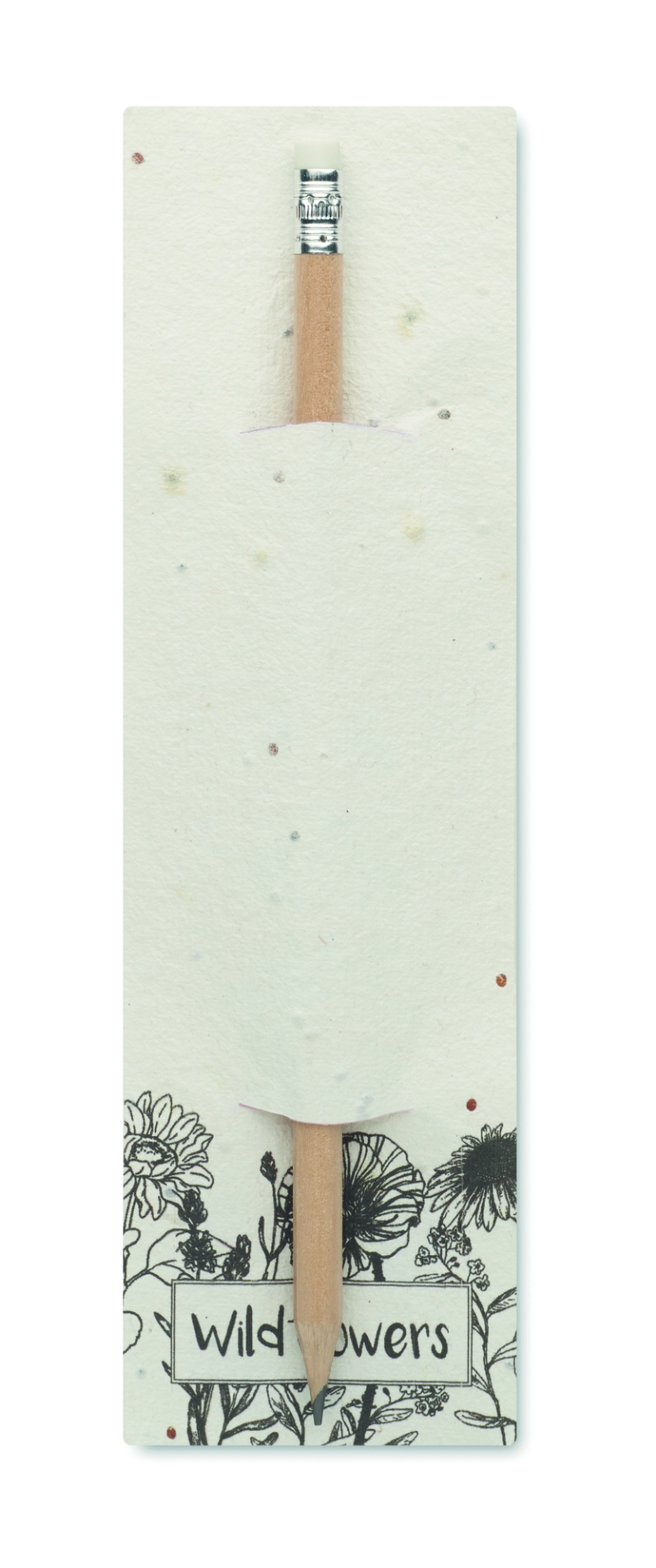 Matita in legno naturale con gomma. presentata in un astuccio di carta di semi (fiori selvatici).