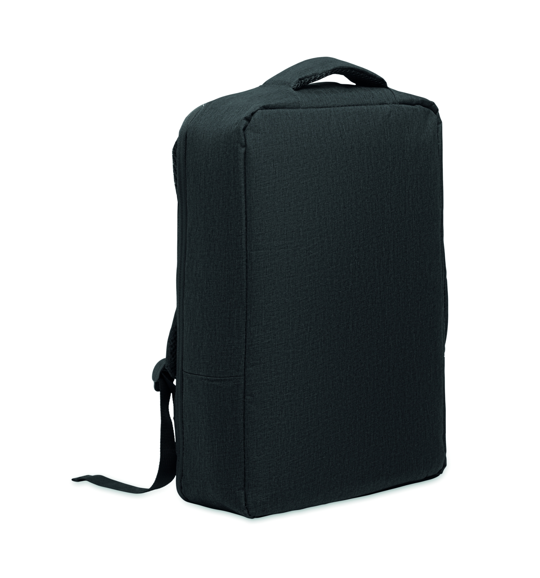 Zaino sottile per laptop da 15 pollici in 300d rpet con apertura a 180° e fodera in 210d rpet. uno scomparto per laptop, 2 tasche interne, 2 tasche interne per penne. maniglie, schienale e spallacci imbottiti. custodia per valigia.