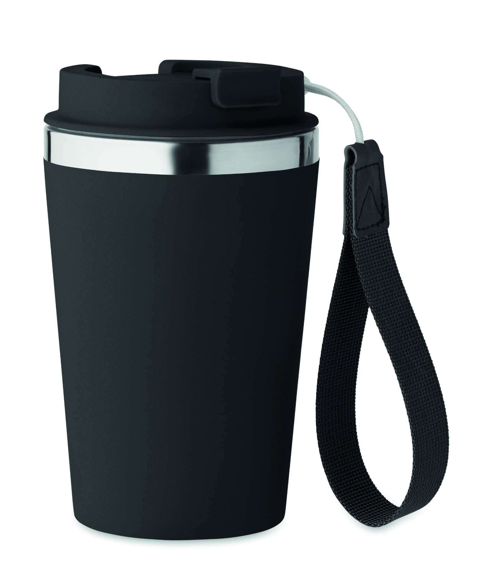 Bicchiere a doppio strato in acciaio inox riciclato (90% acciaio inox riciclato e 10% acciaio inox) con strato esterno in pp e cinturino in rpet. capacità: 350 ml.