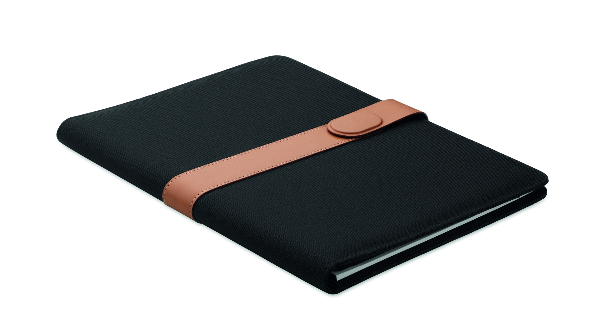Portfolio a4 in rpet con dettagli in ecopelle. blocco note a4 sostituibile.30 pagine a righe in carta riciclata. porta penna. 4 portacarte, 3 piccole tasche e uno scomparto grande. chiusura con cinturino magnetico. fsc®-certified | fsc mix , p8.6, fsc-c213206