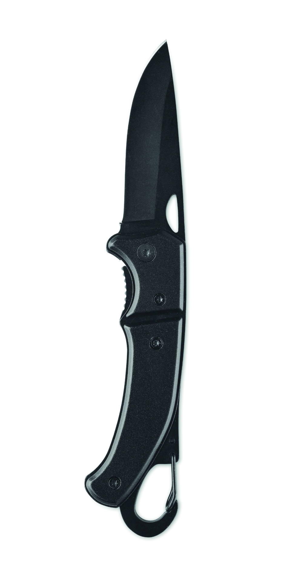 Coltello pieghevole in alluminio con moschettone. lama in acciaio inossidabile. il moschettone non è per l'arrampicata (uso non professionale).