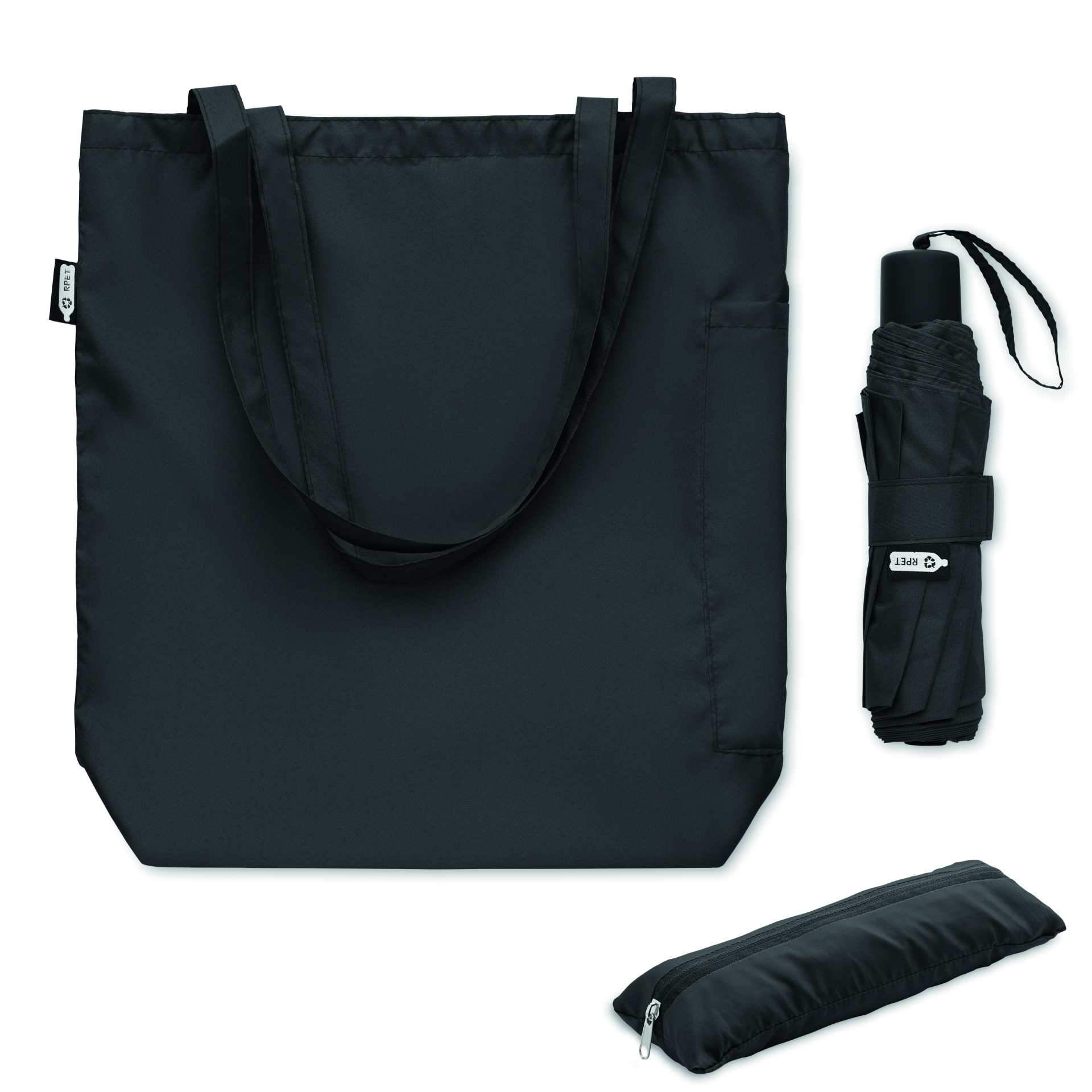 Ombrello antivento da 21 pollici con apertura e chiusura manuale a 3 pieghe in pongee rpet 190t. custodia inclusa. ha uno scomparto nascosto con cerniera per contenere l'ombrello e mantenere asciutto il contenuto della borsa. quando la borsa non è in uso, si arrotola e lo scomparto con cerniera funge da custodia per l'ombrello.