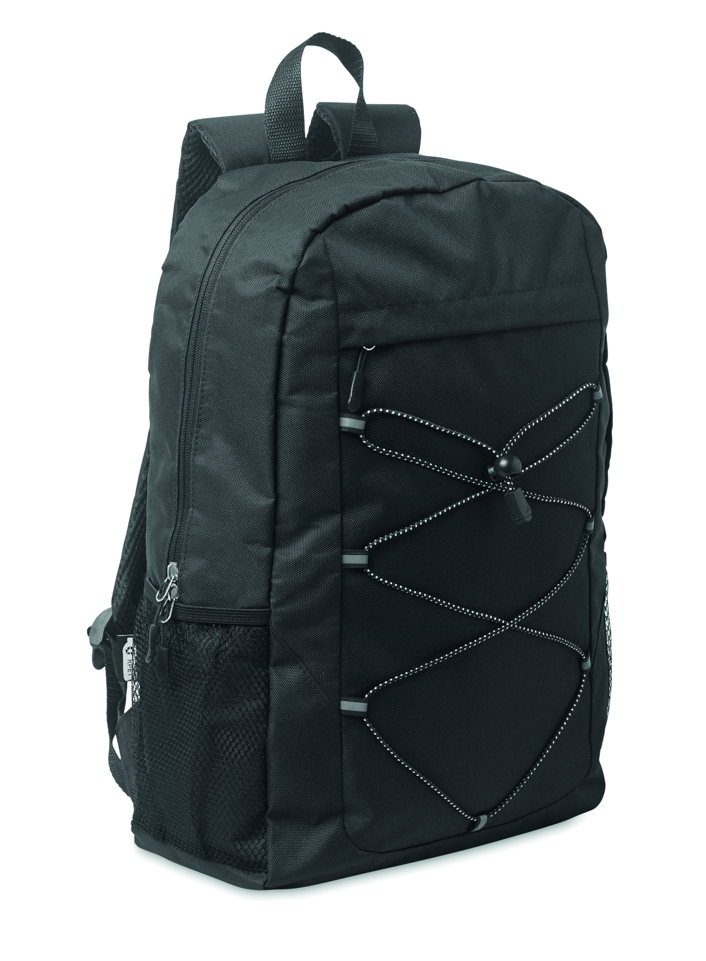 Zaino in poliestere 600d rpet con cordino decorativo e pannello frontale con cerniera. tasche in rete su entrambi i lati.