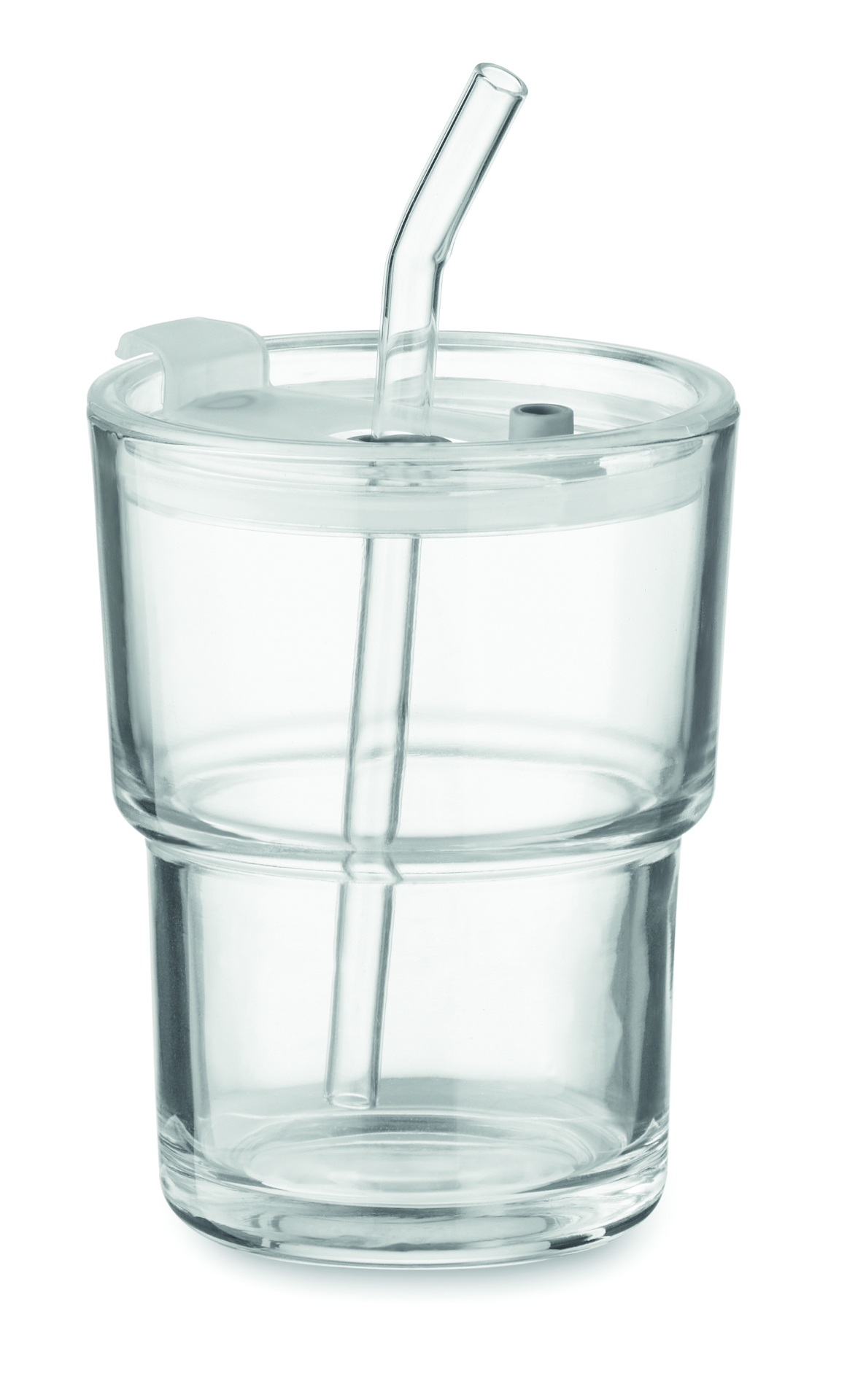 Bicchiere in vetro con coperchio e cannuccia in vetro rimovibile. presa per cannuccia e coperchio con apertura diretta della bevanda senza perdite. capacità 400 ml.