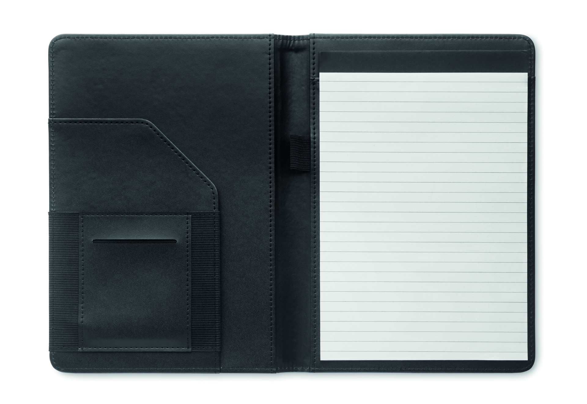Cartella a5 in rpet 300d a 2 toni. blocco note a5 sostituibile. 40 pagine in carta di bamboo a righe bianche (20 fogli). portapenne. porta carte di credito all'interno e uno scomparto grande.