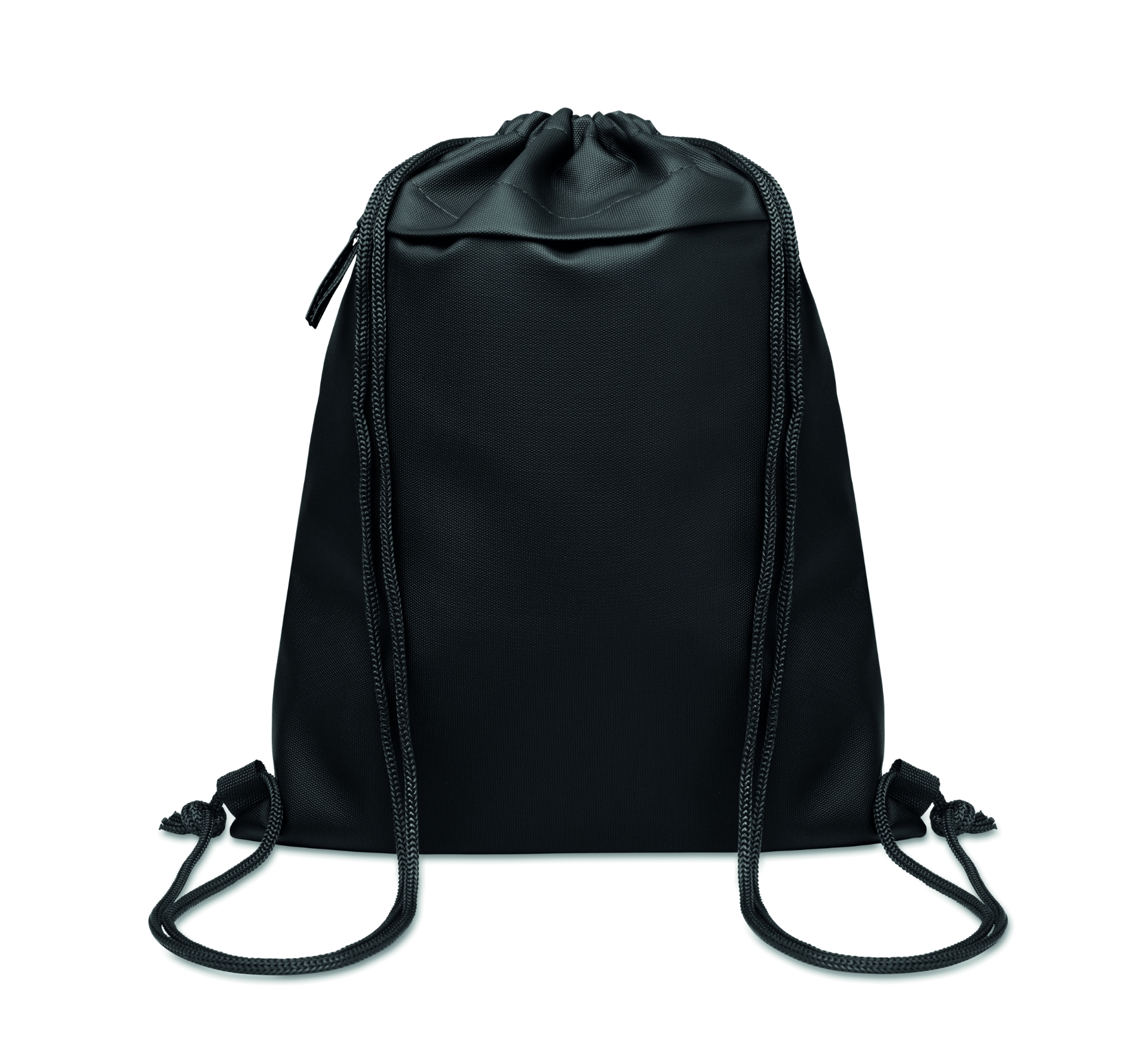 Borsa con coulisse con rivestimento in pu in poliestere 600d rpet e fodera in poliestere 190t rpet. tasca frontale con cerniera.