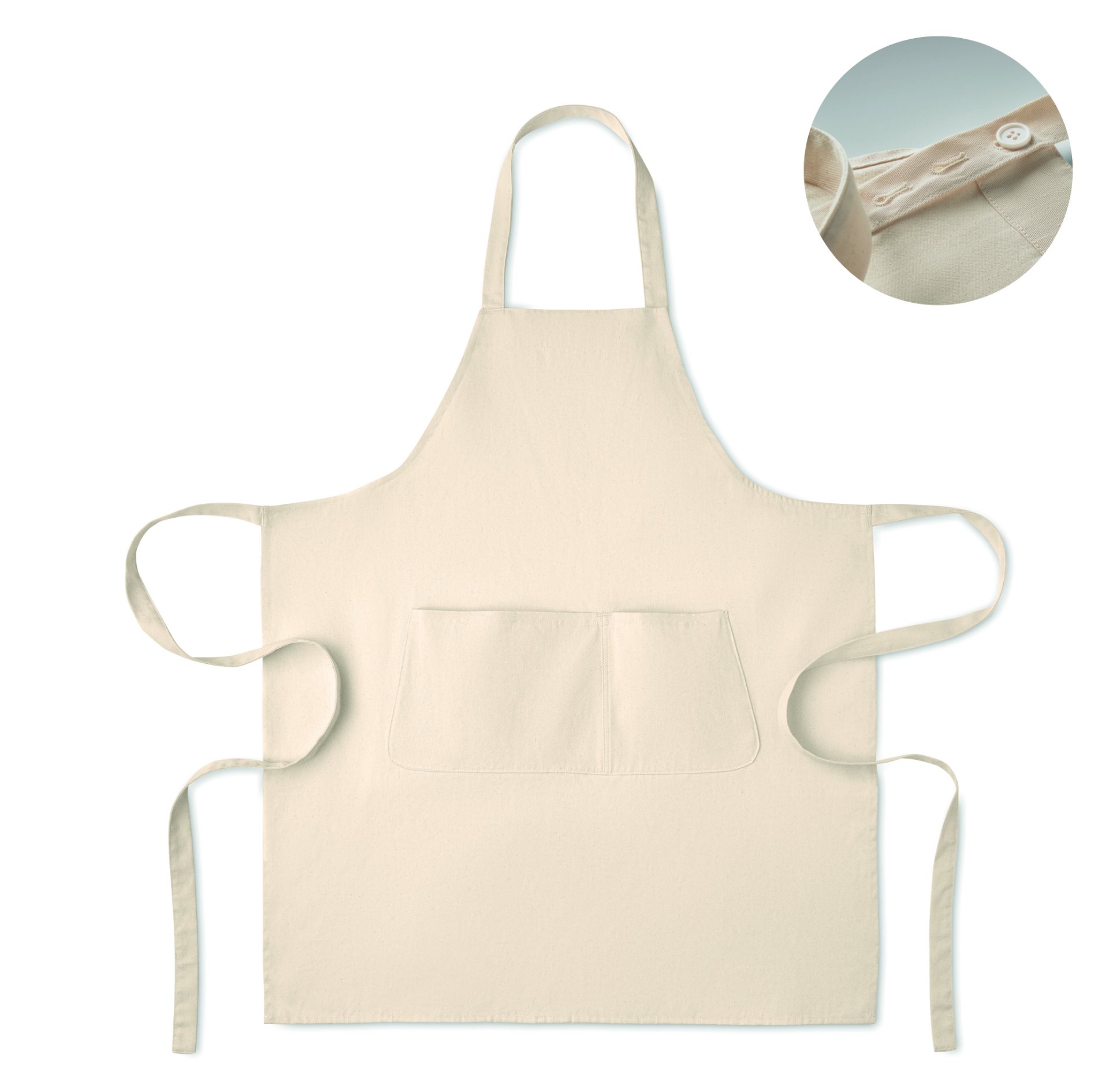 Grembiule regolabile con 1 grande tasca frontale a 2 scomparti in cotone biologico da 240 gr/m². con bottone regolabile sul collarino.