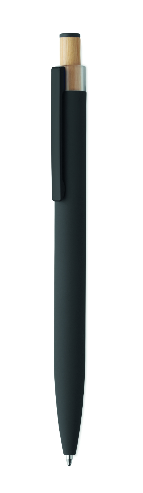 Penna a sfera in alluminio riciclato con pulsante in bambù con dettagli in tinta e clip in metallo abbinata. inchiostro blu.