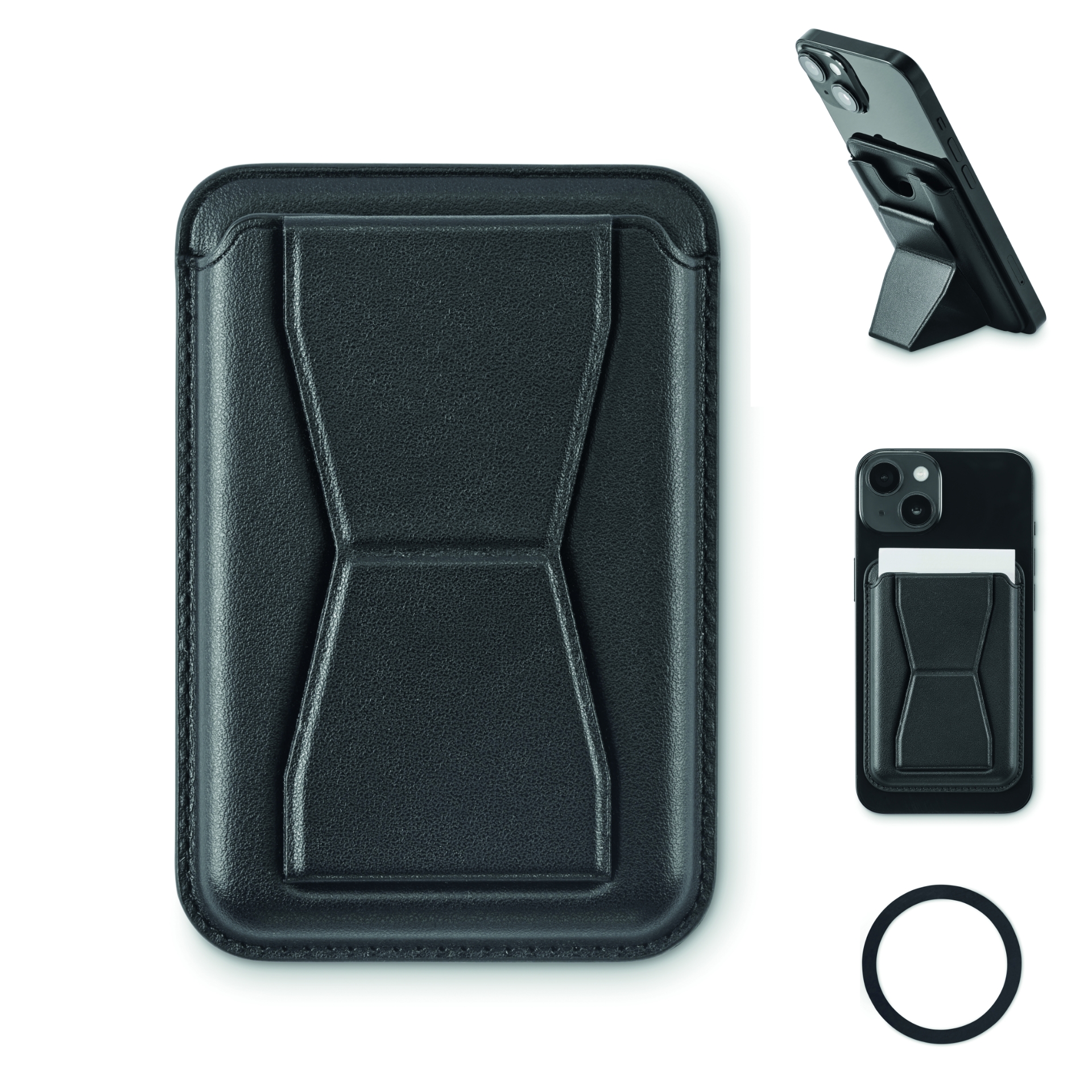 Porta carte telefoniche in pelle pu con funzione stand e chiusura magnetica. compatibile con iphone® 12 e successivi. include un anello metallico magnetico per supportare la ricarica di altri telefoni con ricarica wireless non magnetica.