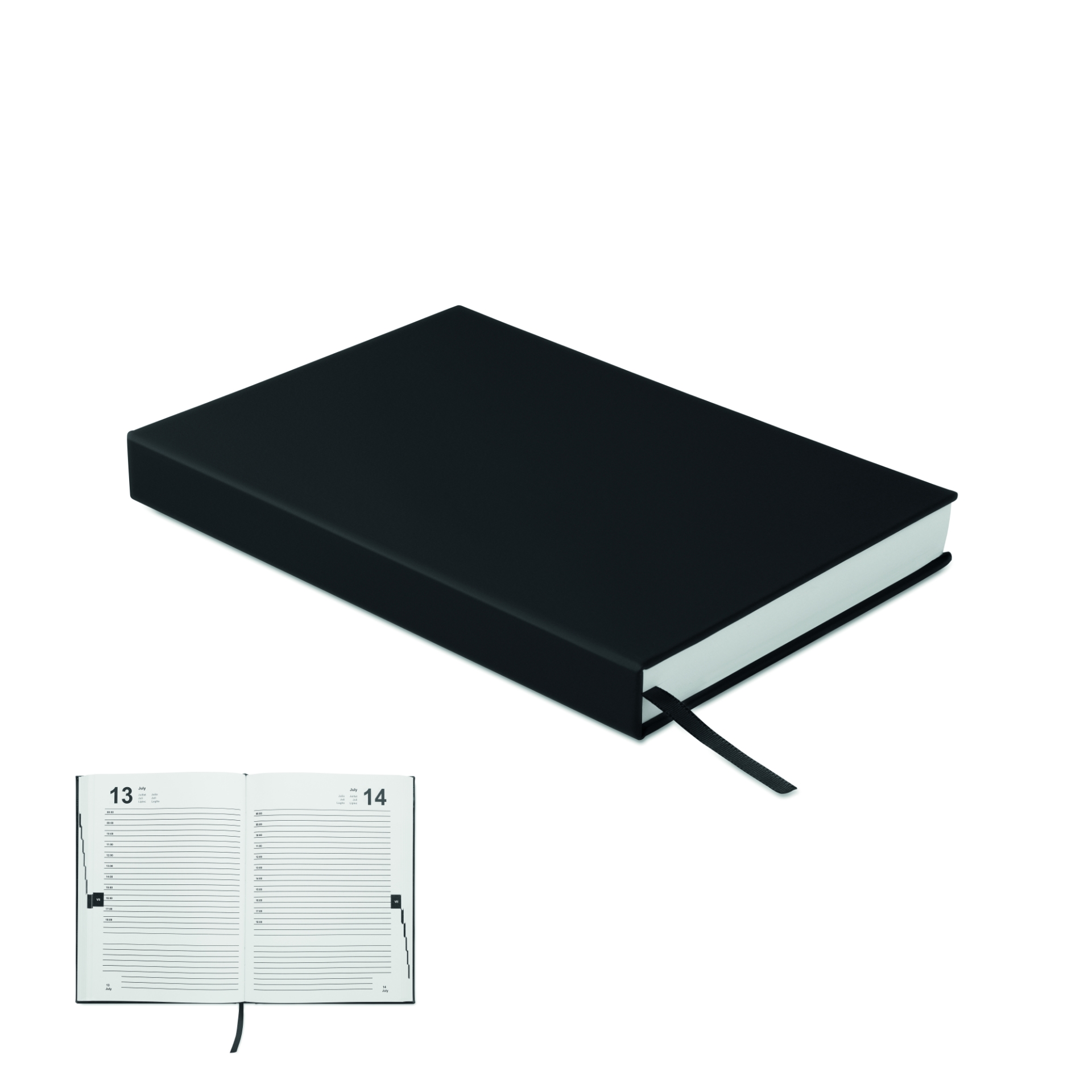 Notebook a5 per agenda giornaliera perpetua con copertina in 60% poliestere riciclato post-consumo e 40% pu. 416 pagine universali in carta riciclata da 70 g/m² (208 fogli). segnapagina in nastro di poliestere in tinta.