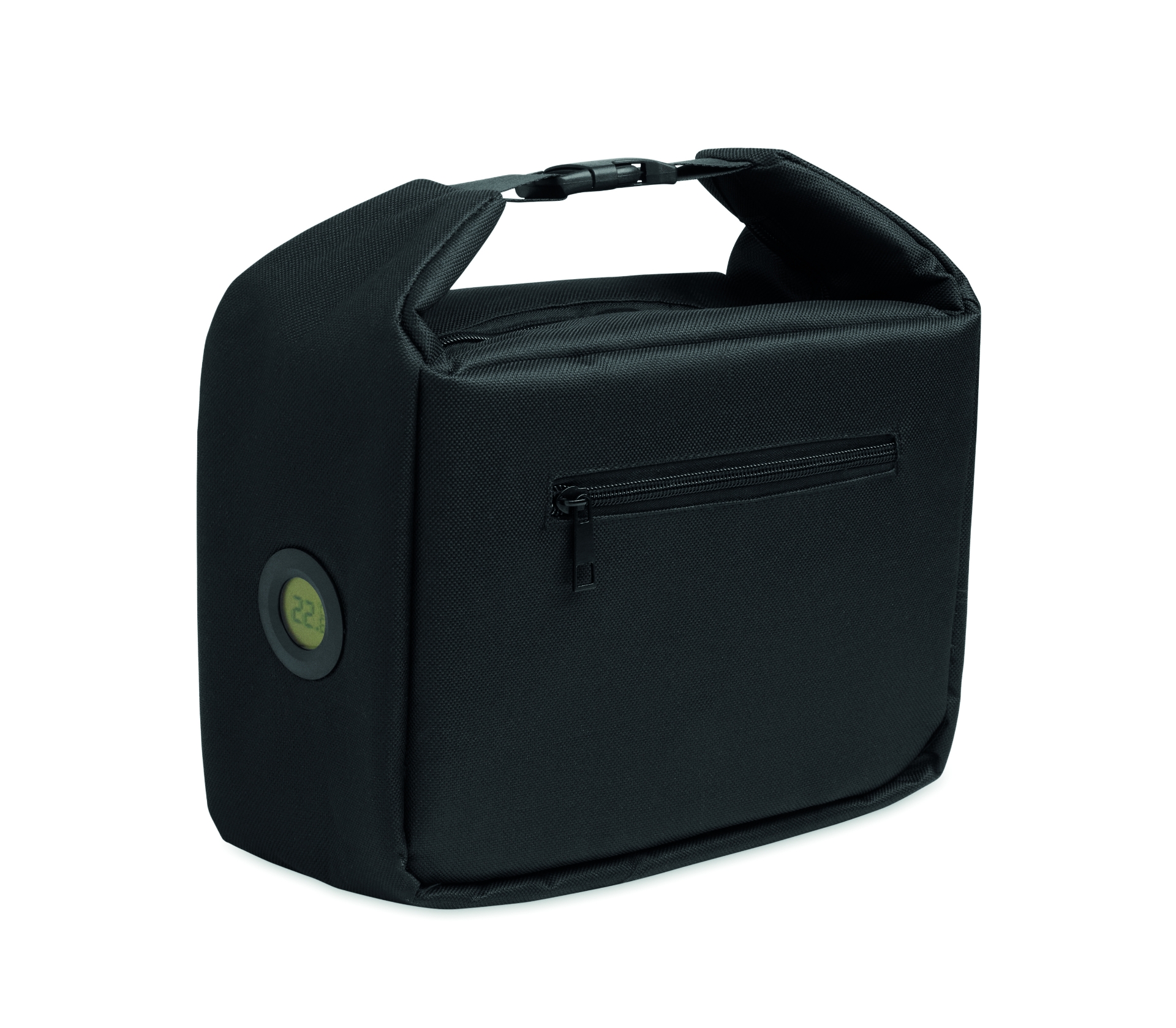 Borsa termica portapranzo con indicatore di temperatura interno, 600d rpet con schiuma pe da 3 mm rivestimento in lamina di alluminio. chiusura con fibbia. tasca laterale con cerniera. capacità: 5 l