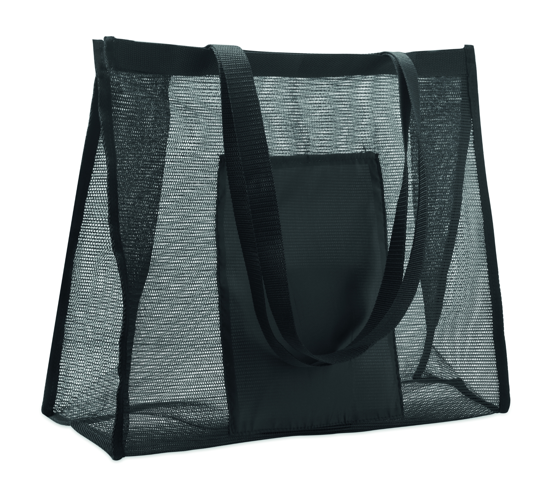 Shopper in rete rpet e 210d rpet con manici corti. include un'ampia tasca frontale aperta. capacità 20l, carico fino a 10 kg.