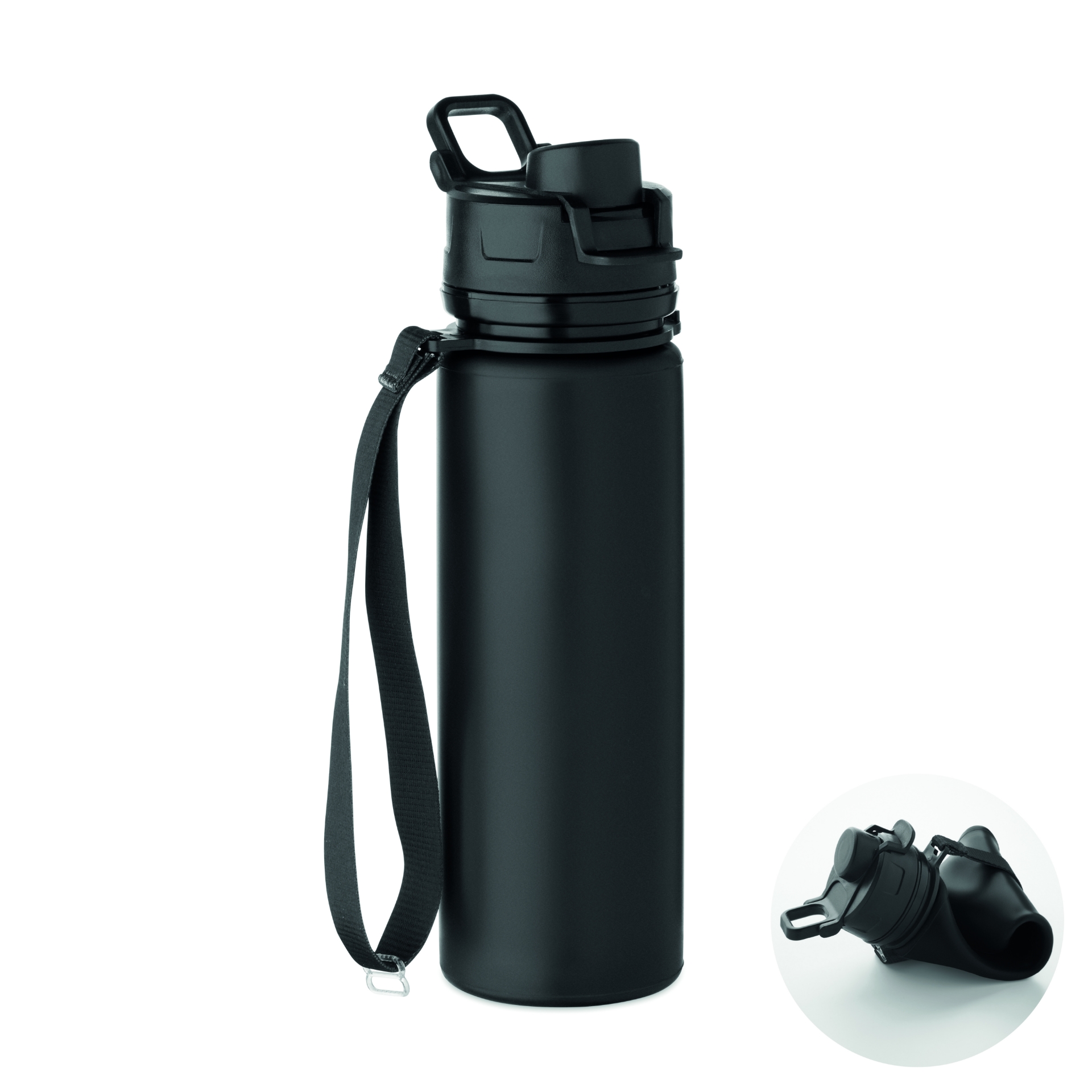Bottiglia sportiva pieghevole in silicone con coperchio in pp, manico, cinturino in poliestere e fibbia trasparente per fissarla quando è piegata. senza perdite. capacità: 500 ml.