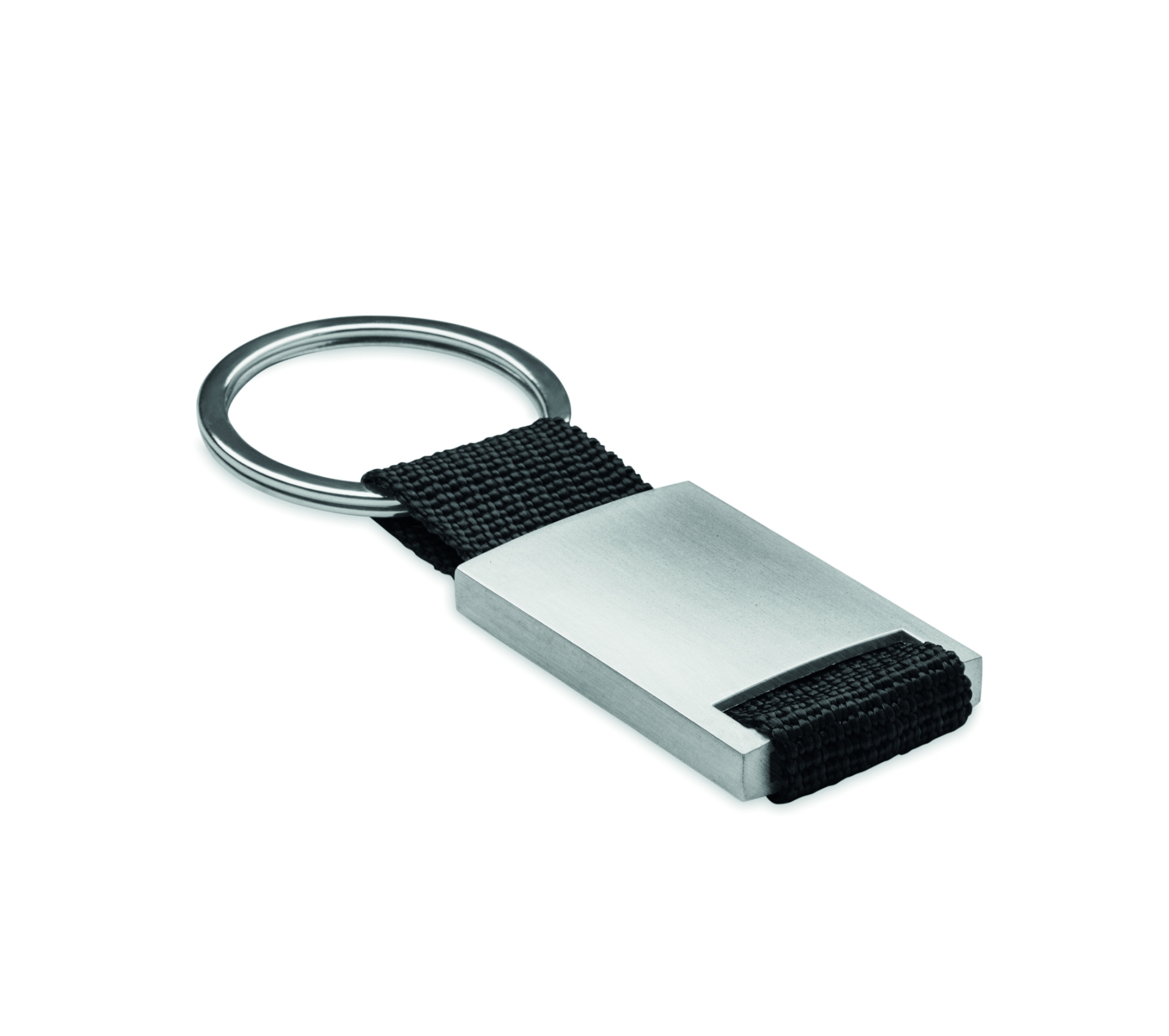 Portachiavi rettangolare in metallo e fascetta colorata.