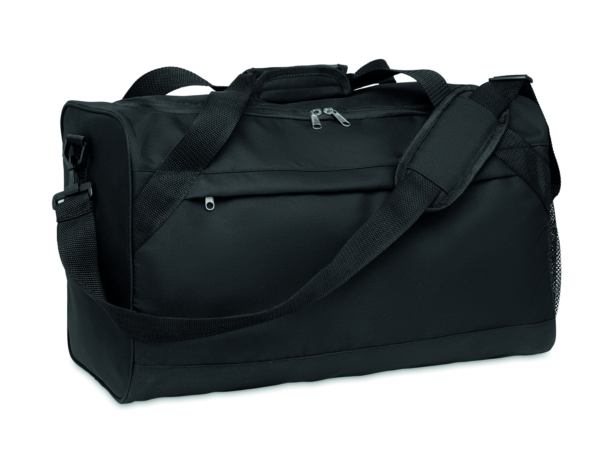 Borsa da sport o da viaggio in rpet 600d con ampia tasca frontale con chiusura a zip, tasca interna con zip e tracolla regolabile e removibile.