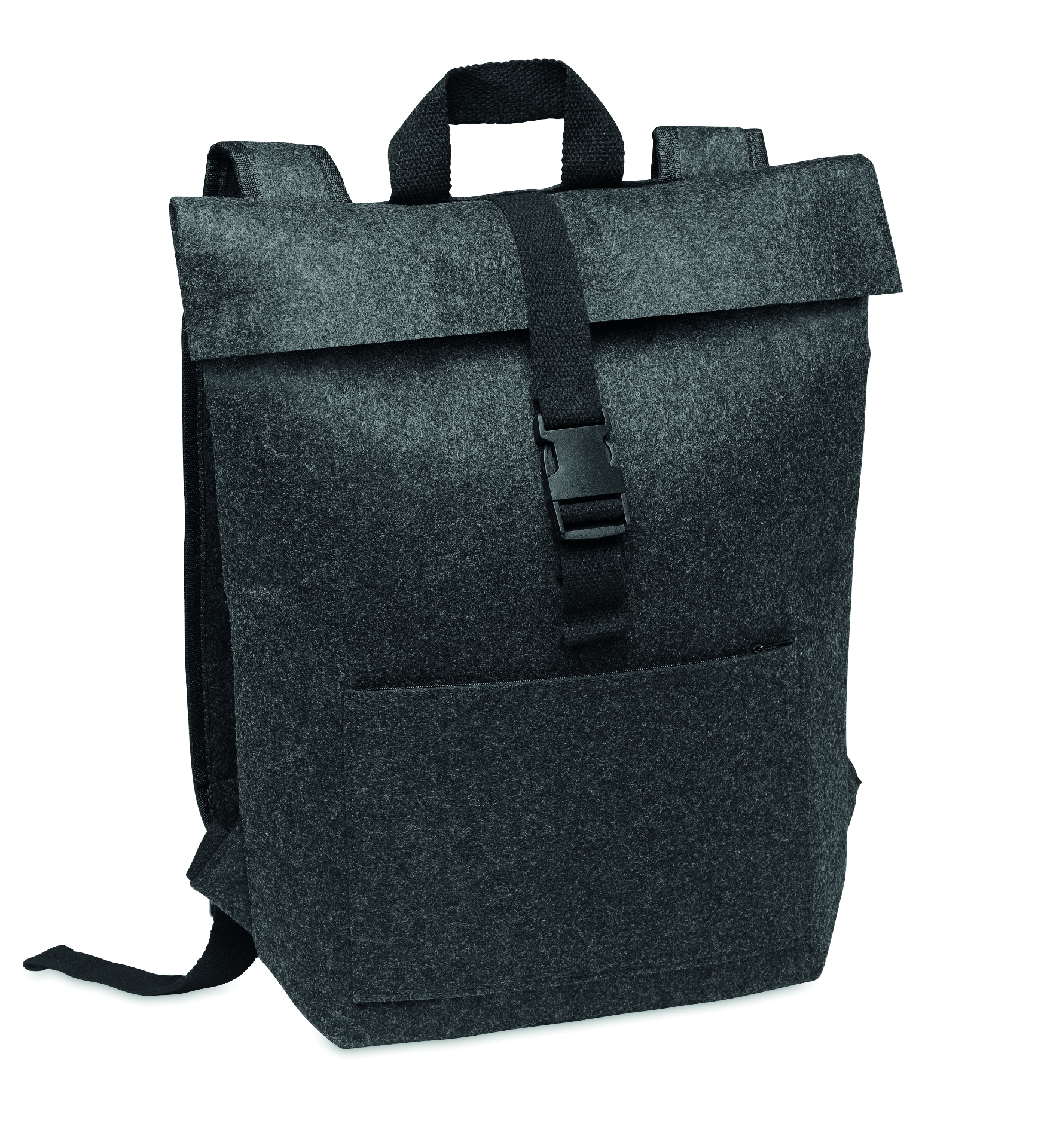 Zaino in feltro rpet con cinturino in cotone, chiusura e tasca con cerniera sul davanti. ha uno scomparto per il computer portatile.