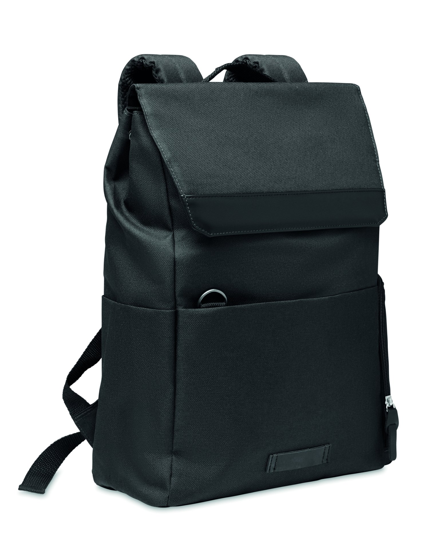 Zaino porta laptop da 15 pollici in rpet 600d 2 toni con bottone a pressione magnetico. scomparto imbottito per laptop, tasche anteriori con cerniera e 2 tasche laterali.