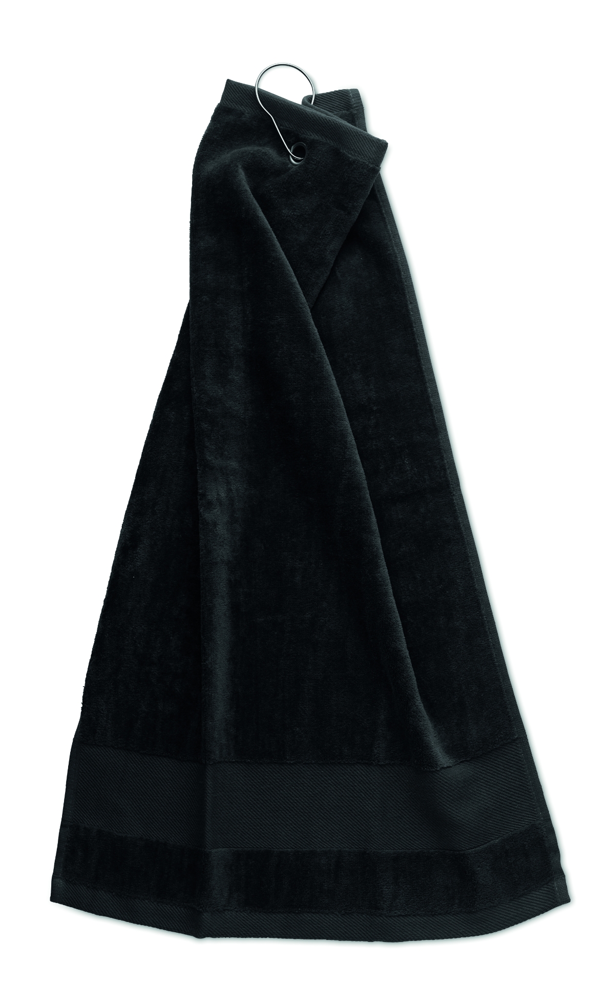 Asciugamano da golf in cotone con un foro di rame e un anello in cima come gancio. 350 gr/m². dimensioni dell'asciugamano: 40x60 cm.