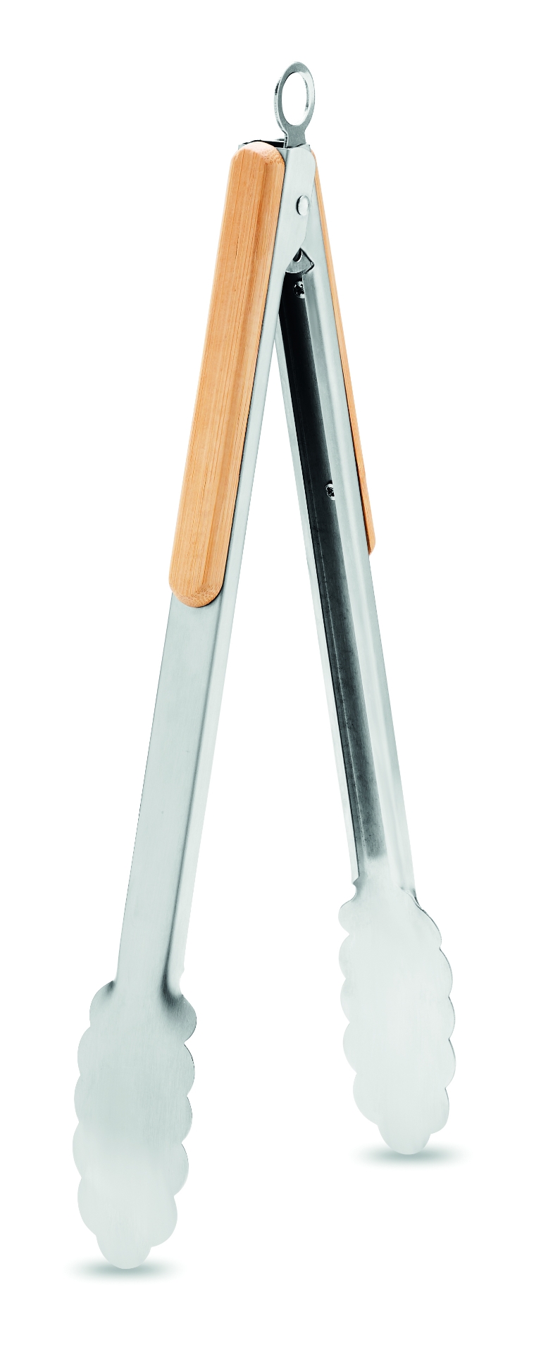 Pinze da barbecue in acciaio inox con impugnature in bamboo. meccanismo di bloccaggio.