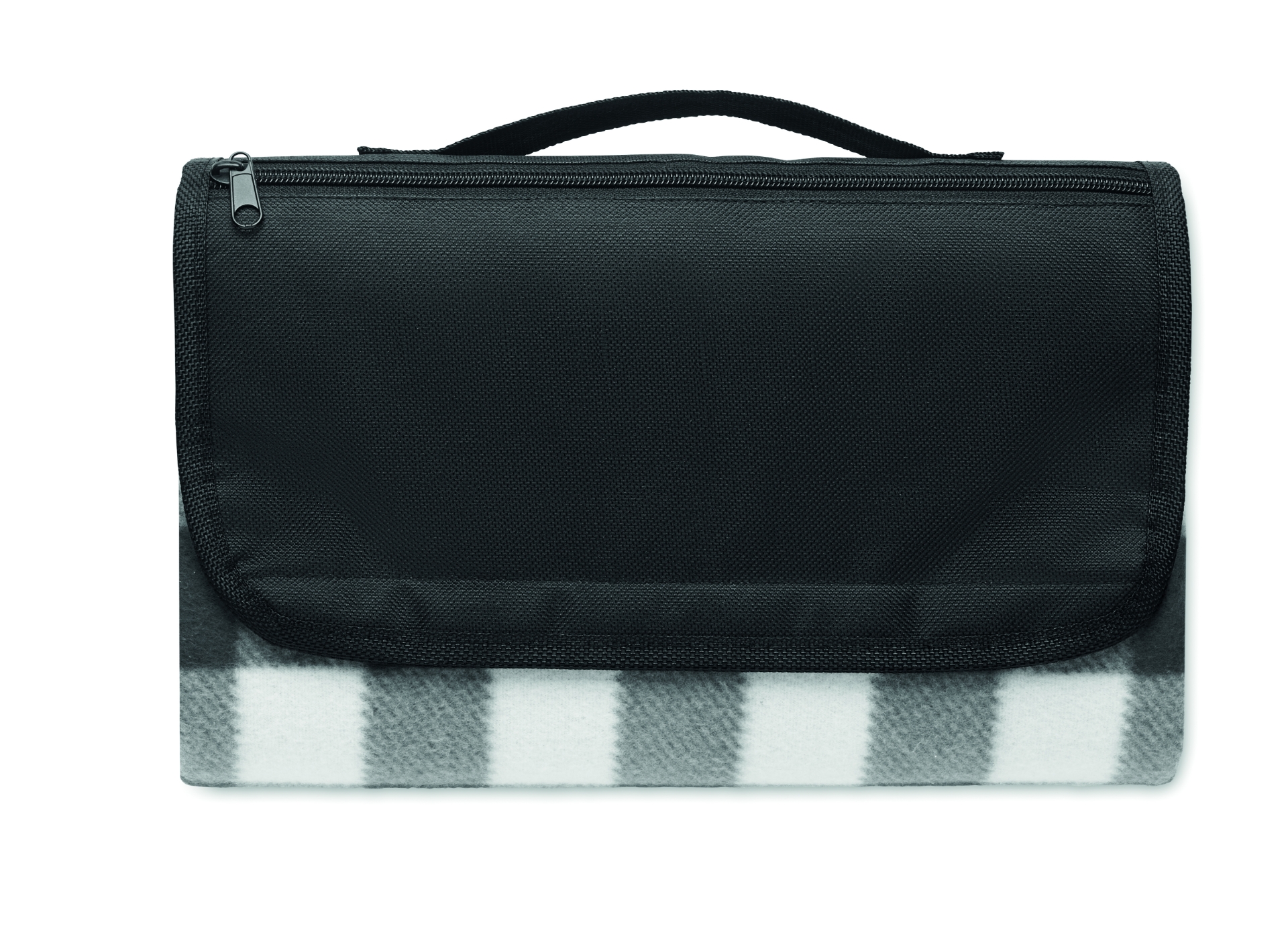 Coperta da picnic pieghevole in pile polare rpet 150 gr/m² con retro in peva rivestito resistente all'acqua. include una tasca anteriore con cerniera e una cinghia di trasporto corta.