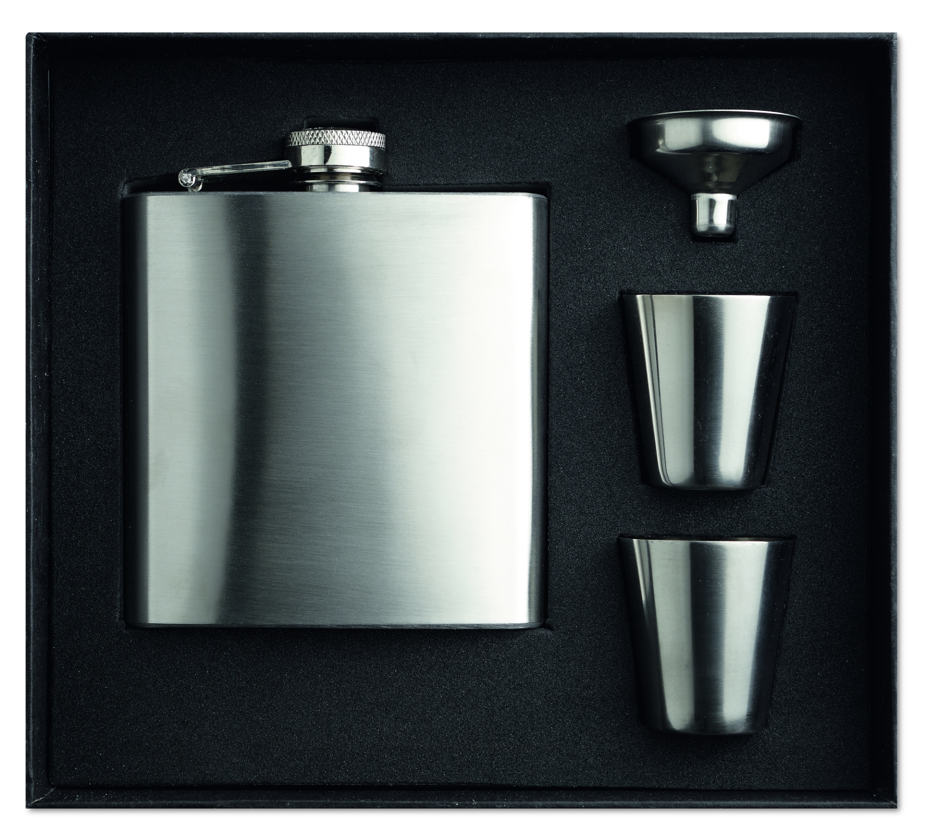 Set composto da: fiaschetta da 175 ml, due bicchierini, imbuto. in confezione regalo nera.