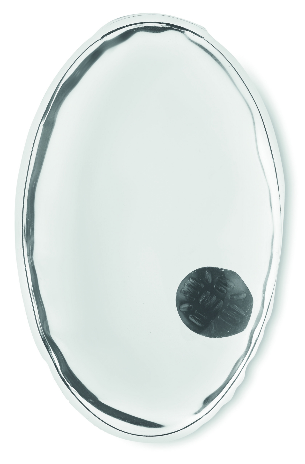 Scaldamani ovale. riutilizzabile scaldato in acqua calda, premendo la placca di metallo all'interno. non necessita batterie.