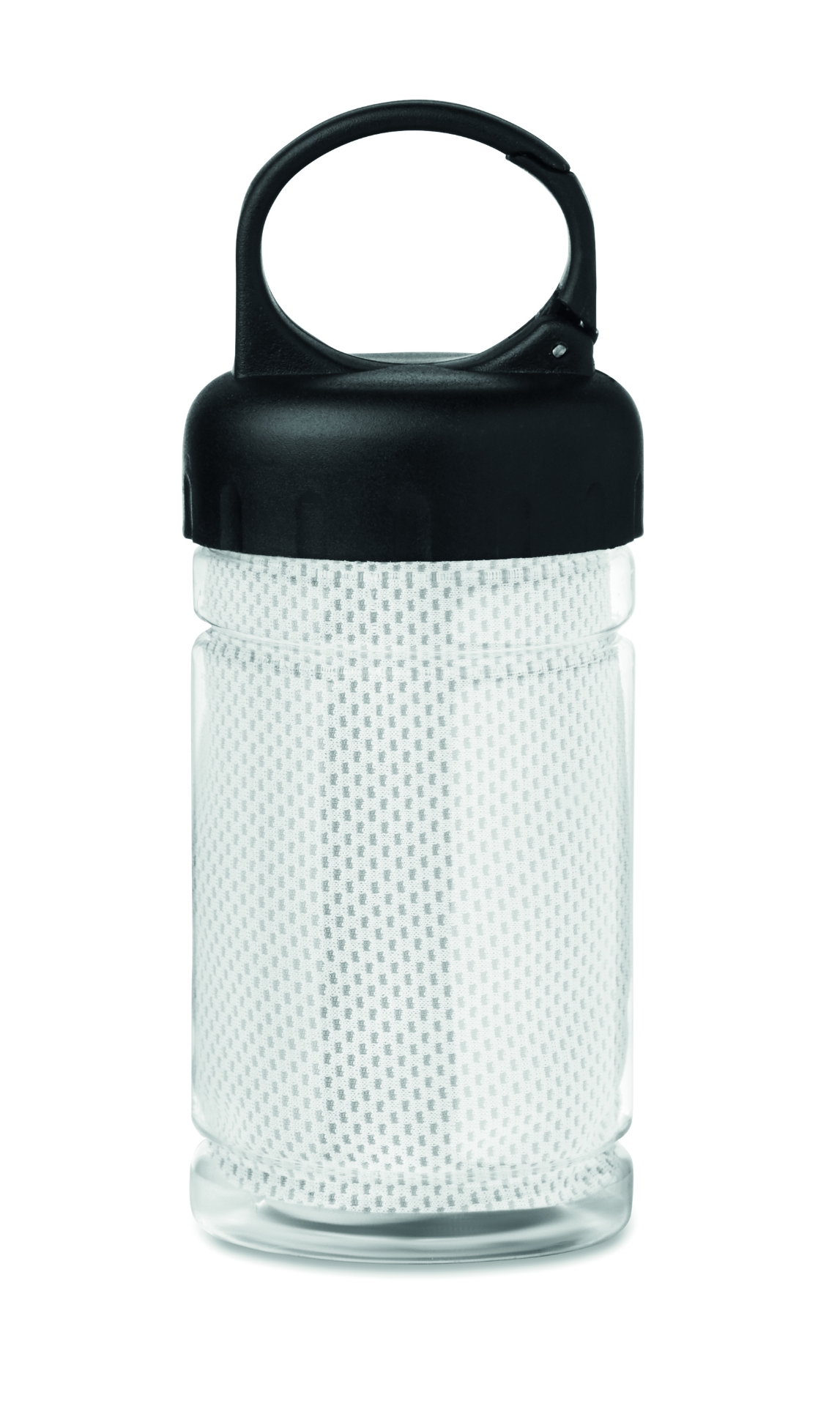 Contenitore in pet con asciugamano sportivo in microfibra all'interno. tappo a vite (senza guarnizione). capacità bottiglia 300 ml. dimensioni asciugamano = 30x80 cm