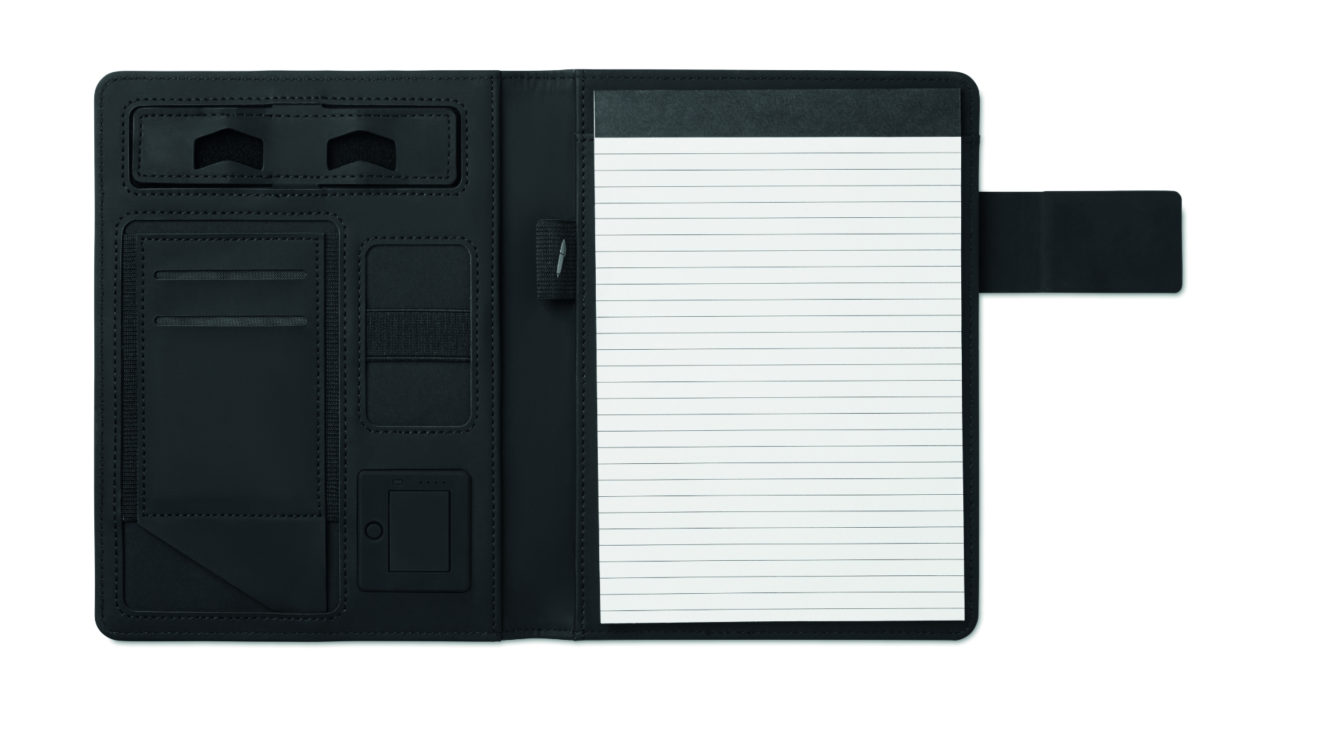 Cartella conferenza a5 con copertina in lino-pu. powerbank da 4000 mah. micro usb integrato a un connettore di tipo c. blocco note da 20 fogli a righe. scomparti interni multipli. chiusura magnetica. portapenne elastico.