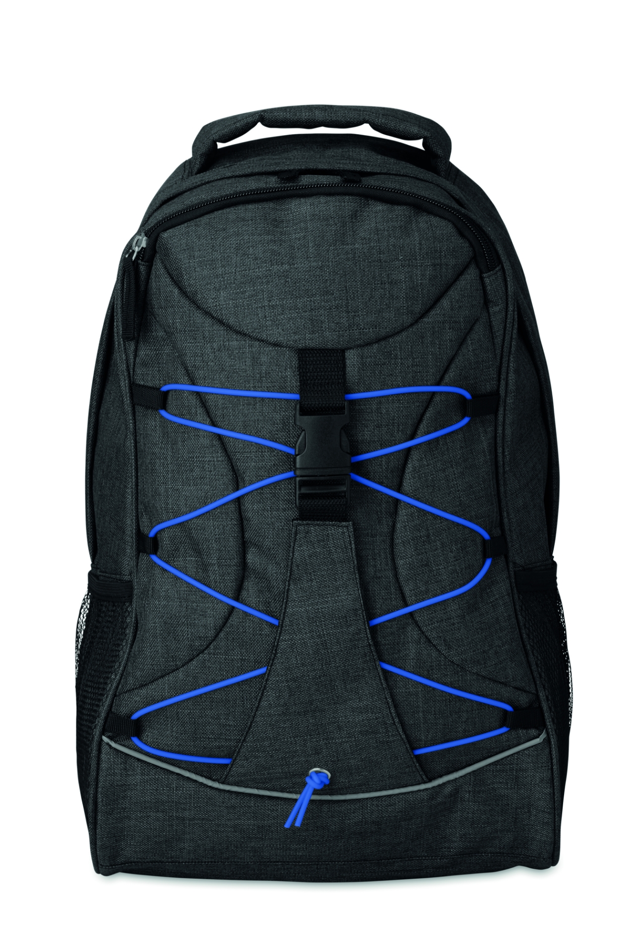 Zaino in poliestere 600d con rivestimento colorato a contrasto. cordino visibile al buio sul pannello frontale. tasche a rete su entrambi i lati.