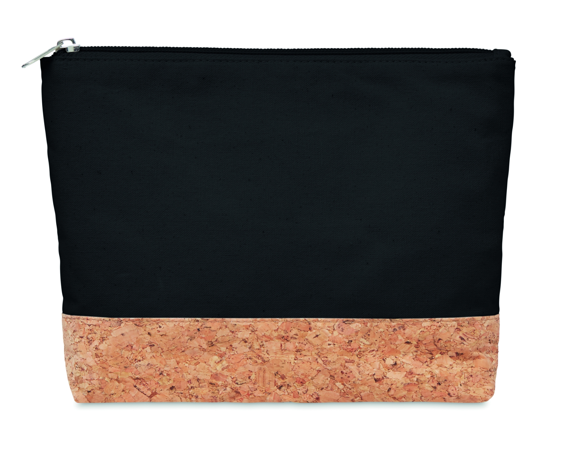 Portacosmetici in cotone 220gr con dettagli in sughero sul fondo.