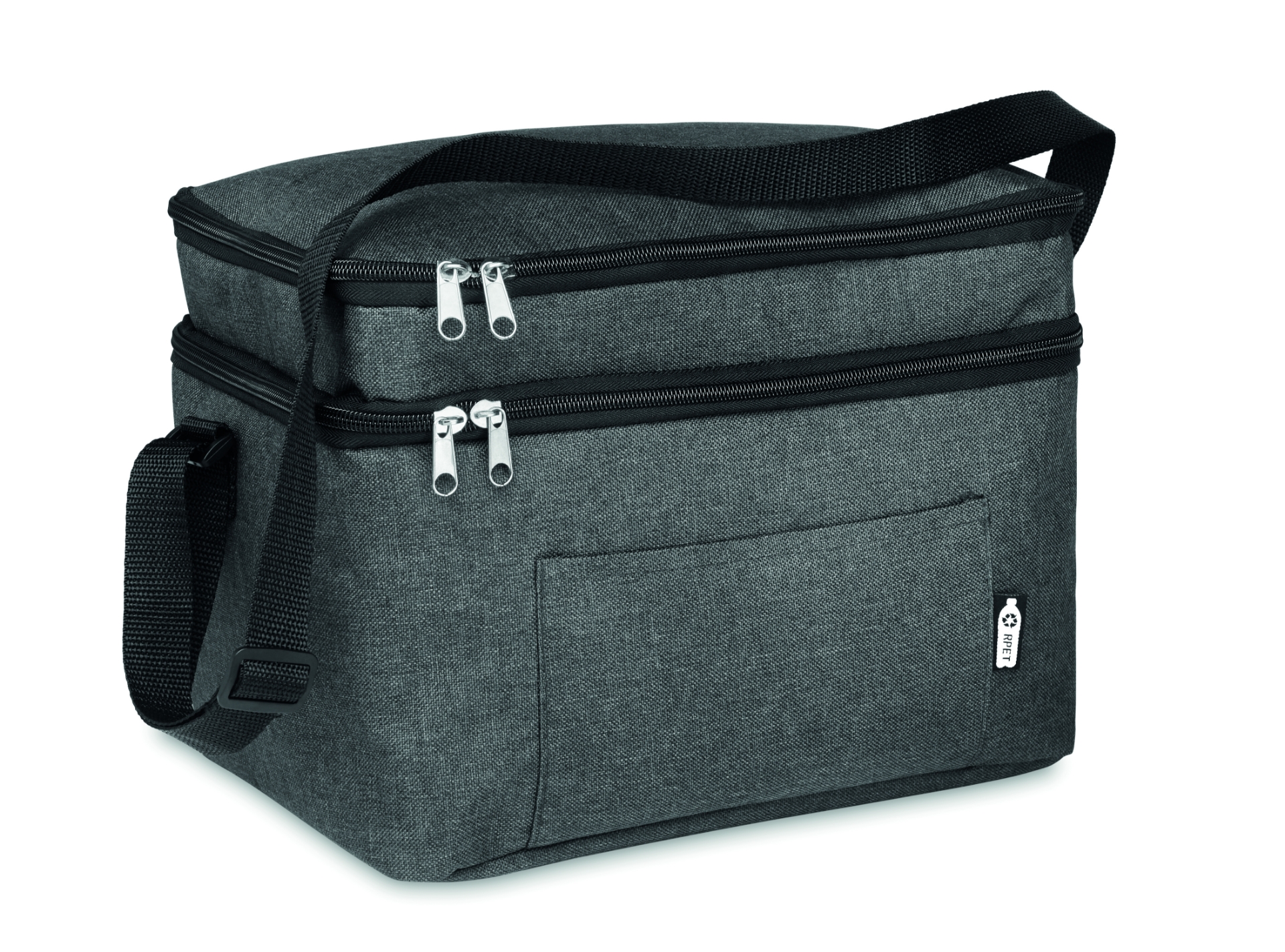 Borsa frigo in rpet 600d con 2 scomparti e fodera in peva. tracolla regolabile e tasca frontale. capacità 3litri.